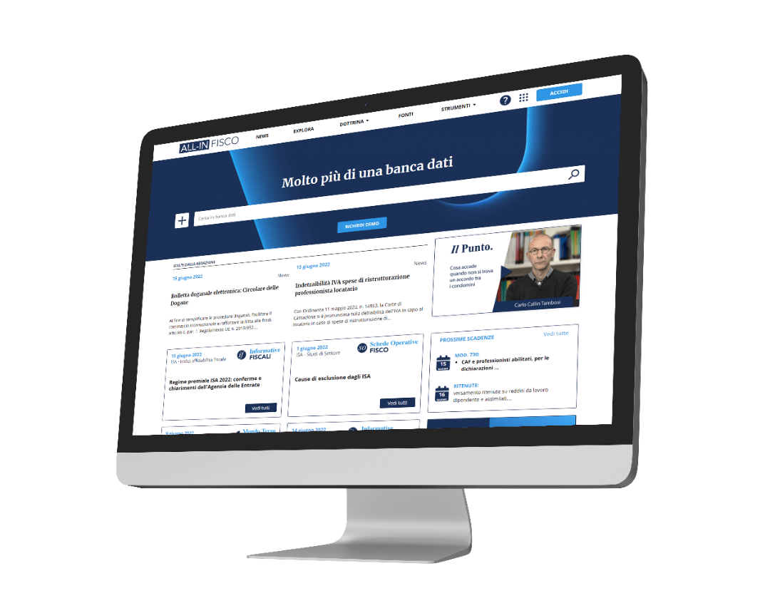 ALL-IN ti dà ogni giorno il benvenuto con tutte le novità in arrivo grazie a news, approfondimenti, quesiti risolti, che garantiscono l’aggiornamento continuo del consulente e dei suoi collaboratori.